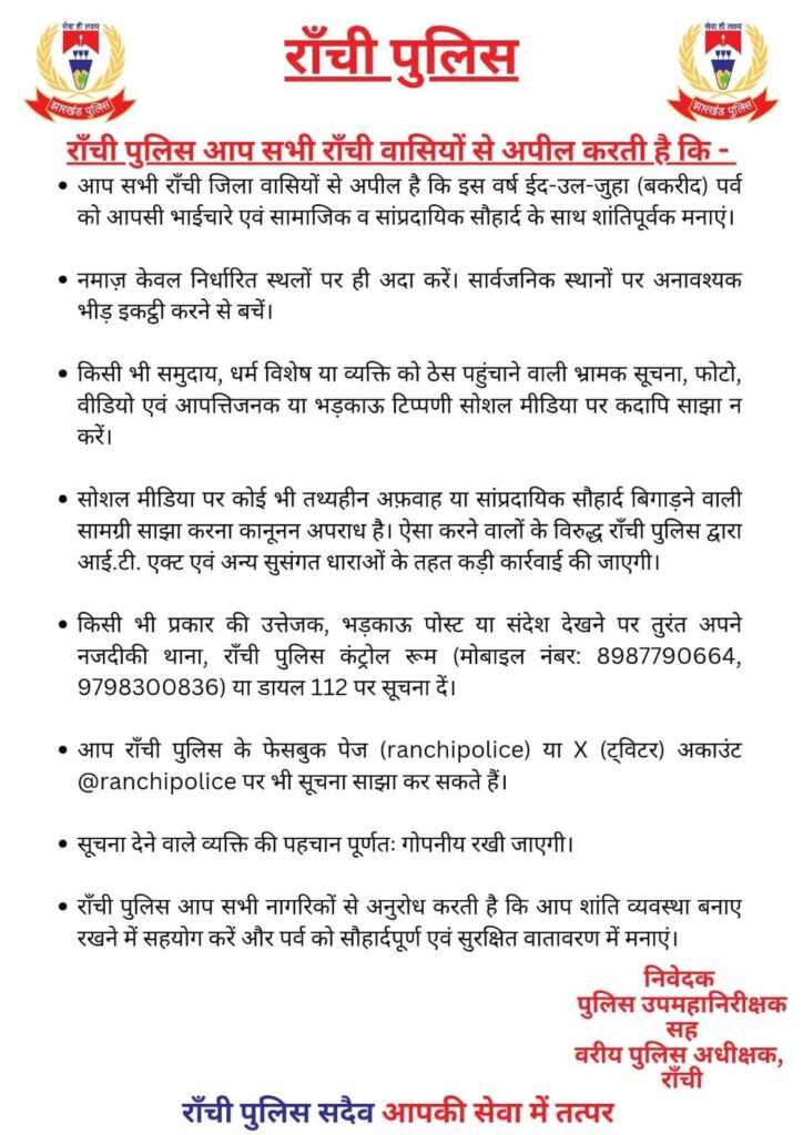 - राँची पुलिस आप सभी नागरिकों से अनुरोध करती है कि आप शांति व्यवस्था बनाए रखने में सहयोग करें और पर्व को सौहार्दपूर्ण एवं सुरक्षित वातावरण में मनाएं।