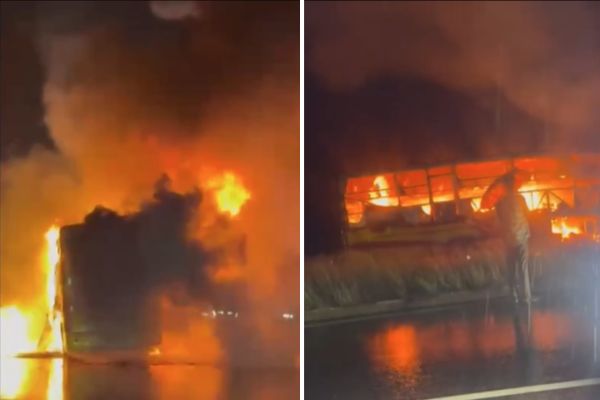 VIDEO | Kurnool, Andhra Pradesh: A bus travelling from Bengaluru to Hyderabad caught fire near Kurnool district; several lives are feared lost. Rescue operations are underway. More details are awaited.#Kurnool #AndhraPradesh #BusAccident