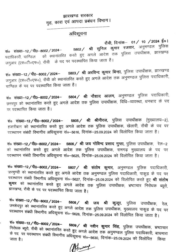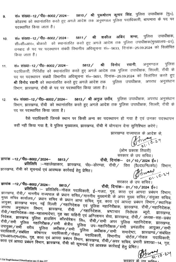रांची: झारखंड सरकार ने 12 पुलिस पदाधिकारियों का तबादला कर दिया है. इसकी अधिसूचना जारी कर दी गई है. सुनिल कुमार रजवार अनुमण्डल पुलिस पदाधिकारी चाण्डिल को स्थानांतरित करते हुए अगले आदेश तक पुलिस उपाधीक्षक, झारखण्ड जगुआर (एसटीएफ), रांची के पद पर पदस्थापित किया जाता है. अरविन्द कुमार बिन्हा पुलिस उपाधीक्षक झारखण्ड जगुआर (एसटीएफ) रांची को स्थानांतरित करते हुए अगले आदेश तक अनुमण्डल पुलिस पदाधिकारी चाण्डिल के पद पर पदस्थापित किया जाता है.
