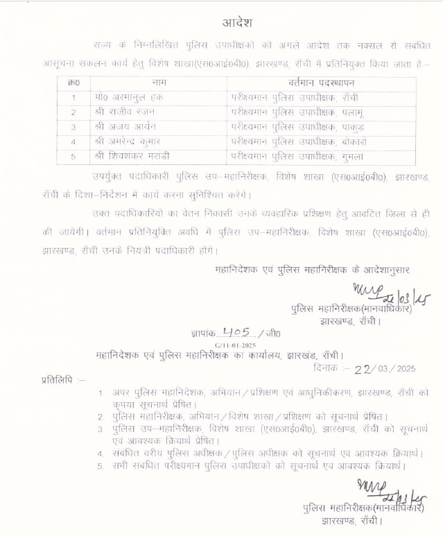 Ranchi : झारखंड में नक्सलियों का खात्मा करने के लिए पुलिस ने अपनी ताकत बढ़ाई है। नक्सल विरोधी अभियान से जुड़े काम के लिए 24 ट्रेनी DSP को लगाया गया है। वहीं, 5 DSP को नक्सलियों के सूचना संकलन का जिम्मा दिया गया है। ये सभी DSP दोनों विभाग में नक्सल से संबंधित कार्यभार संभालेंगे और सूचना संकलन करेंगे। संबंधित अधिसूचना शनिवार को जारी कर दी गयी है। कौन DSP कहां गये… देखें पूरी लिस्ट