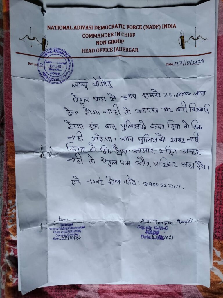 बरहेट थाना क्षेत्र से पकड़े गए आदिवासी कोबरा मिलिट्री ऑफ असम के सदस्यों ने पूछताछ में बताया कि वे लोग इस क्षेत्र में अपने संगठन का विस्तार करने में लगे थे. इसके लिए पैसे के इंतजाम के लिए भाजपा नेत्री रेणुका मुर्मू के पति और पेट्रोल पंप व्यवसाई लालू भगत से 25 लाख रुपए की मांग की गई. यह भी धमकी दी गई की यदि पैसा नहीं देते है और पुलिस को सूचना दी तो घर सहित पूरे परिवार को बम से उड़ा देंगे. यह धमकी एनडीएएफ के लेटर पैड पर दी गई. जो पुलिस के हाथ लग गई.