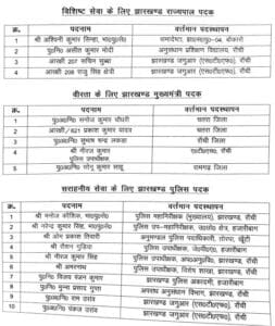 रांची: झारखण्ड राज्य स्थापना दिवस-2023 (15 नवंबर) पर 40 पुलिस पदाधिकारियों/कर्मियों को विशिष्ट सेवा के लिए झारखण्ड राज्यपाल पदक, वीरता के लिए झारखण्ड मुख्यमंत्री पदक एवं सराहनीय सेवा के लिए झारखण्ड पुलिस पदक पदक प्रदान किया जाएगा. इसकी लिस्ट गृह, कारा एवं आपदा प्रबंधन विभाग ने जारी कर दी है. जिसमें आईपीएस अश्विनी कुमार सिन्हा, पुनि असीत कुमार मोदी अनुसंधान प्रशिक्षण विद्यालय रांची, आरक्षी 207 सचिन सुब्बा झारखंड जगुआर (एसटीएफ) रांची, आरक्षी 208 राजु सिंह क्षेत्री झारखंड जगुआर (एसटीएफ) रांची का नाम झारखंड राज्यपाल पदक के लिए भेजा गया है.