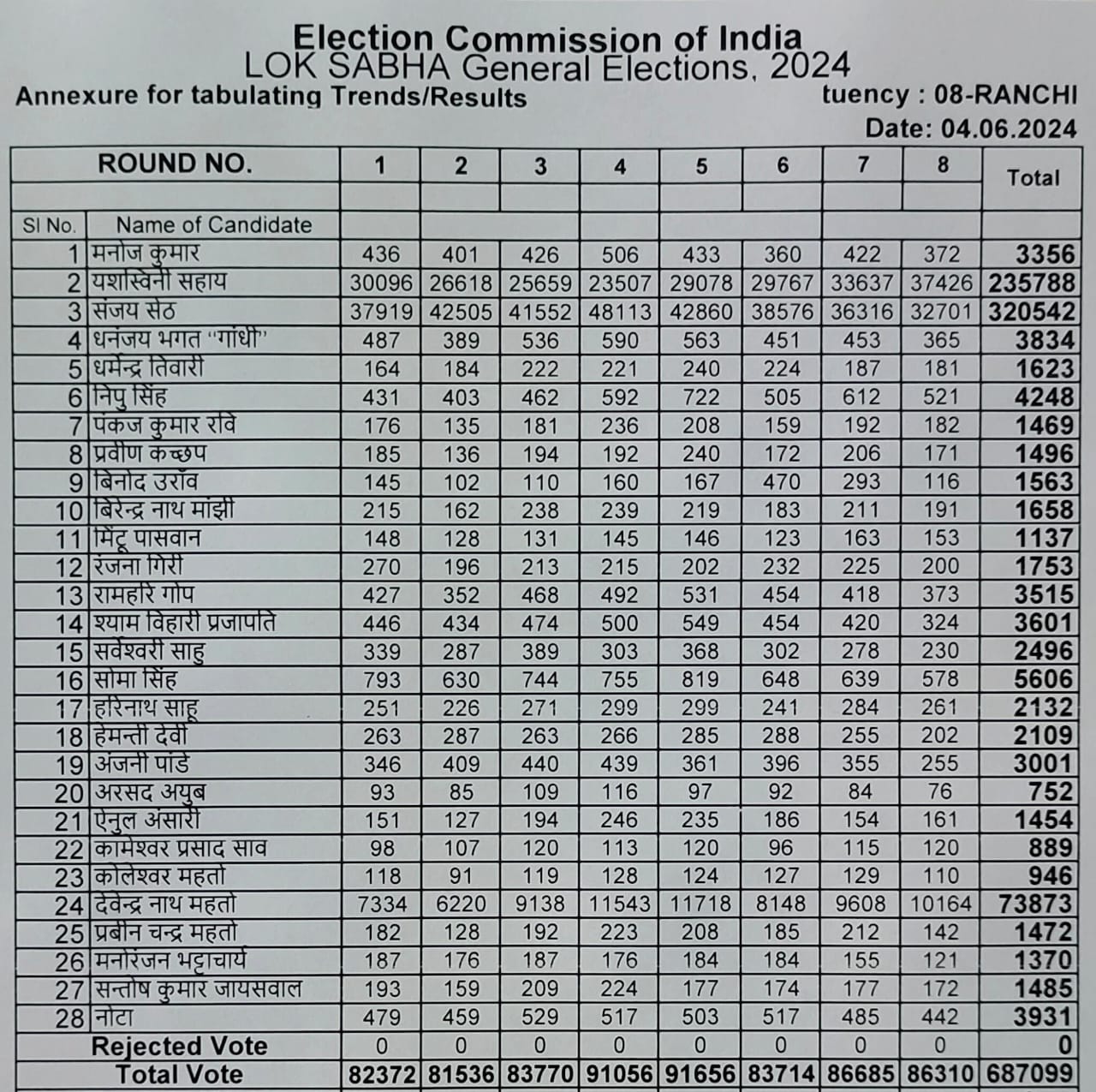 रांची : 8वें राउंड की गिनती में रांची से बीजेपी के संजय सेठ को 32701 वोट मिले है. वहीं कांग्रेस की यशस्विनी सहाय को 37426 वोट मिले है. अबतक की काउंटिंग में संजय सेठ को 320542 वोट मिले है. वहीं यशस्विनी को 235788 वोट मिले है. ऐसे में संजय सेठ पांचवें राउंड की गिनती के बाद 84754 वोट से आगे चल रहे है.