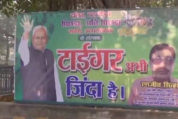 Patna : बिहार विधानसभा चुनाव में दो चरण की वोटिंग खत्म होने के बाद अब मतगणना का इंतजार है। 14 नवंबर को मतगणना होगी और दोपहर तक साफ हो जाएगा कि बिहार में अगली सरकार कौन बनाएगा और नया मुख्यमंत्री कौन होगा। मतगणनों से पहले ही दोनों प्रमुख गठबंधनों के बीच पोस्टर वॉर शुरू हो गया है। पटना की सड़कों पर जनता दल (यू) कार्यालय के बाहर CM नीतीश कुमार का बड़ा पोस्टर लगाया गया है, जिस पर लिखा है “टाइगर अभी जिंदा है।” यह पोस्टर पूर्व मंत्री रणजीत सिन्हा ने लगवाया है और इसमें नीतीश कुमार को दलित, पिछड़ा, अल्पसंख्यक और सवर्ण वर्गों का संरक्षक बताया गया है।