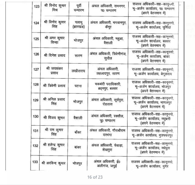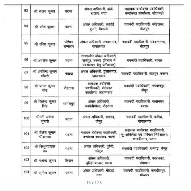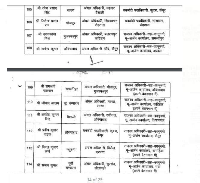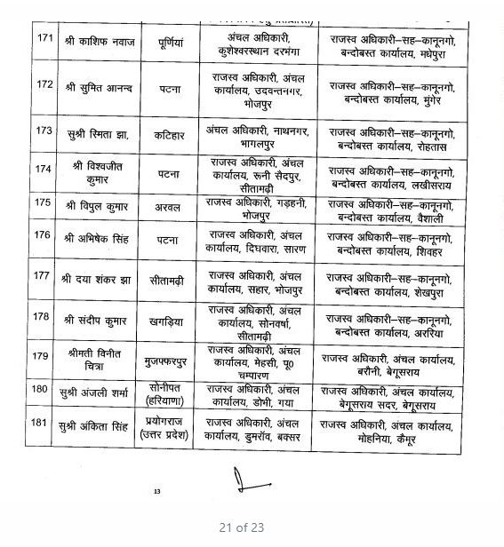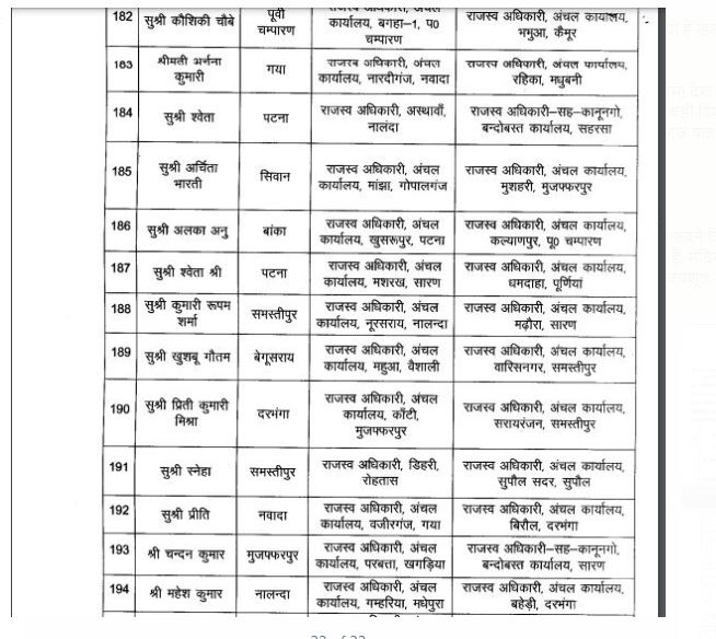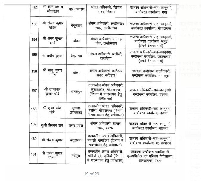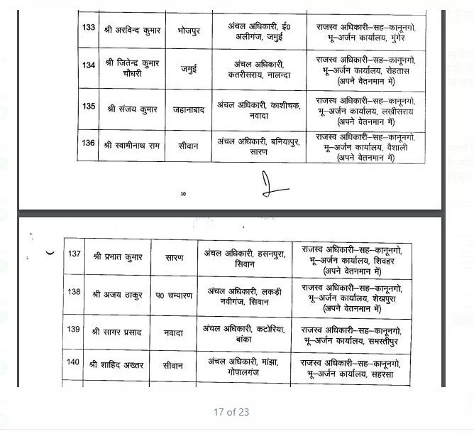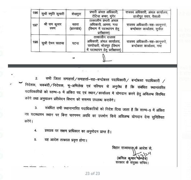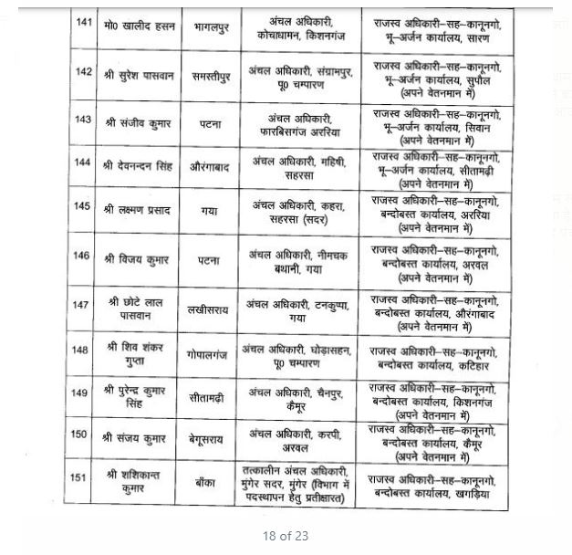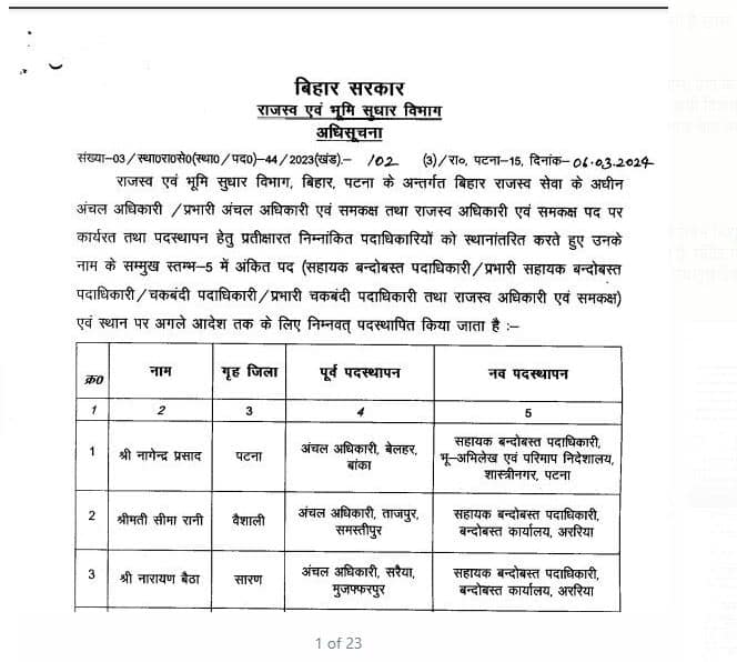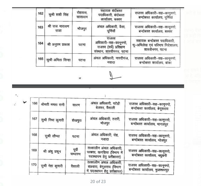 पटना : बिहार में तबादलों का दौरा जारी है. IAS-IPS, DSP-SDPO के तबादले के बाद अब भूमि एवं राजस्व विभाग में 198 अंचलाधिकारी और समकक्ष अधिकारियों का तबादला कर दिया गया. इसको लेकर सामान्य प्रशासन विभाग की ओर से अधिसूचना जारी कर दी गई.