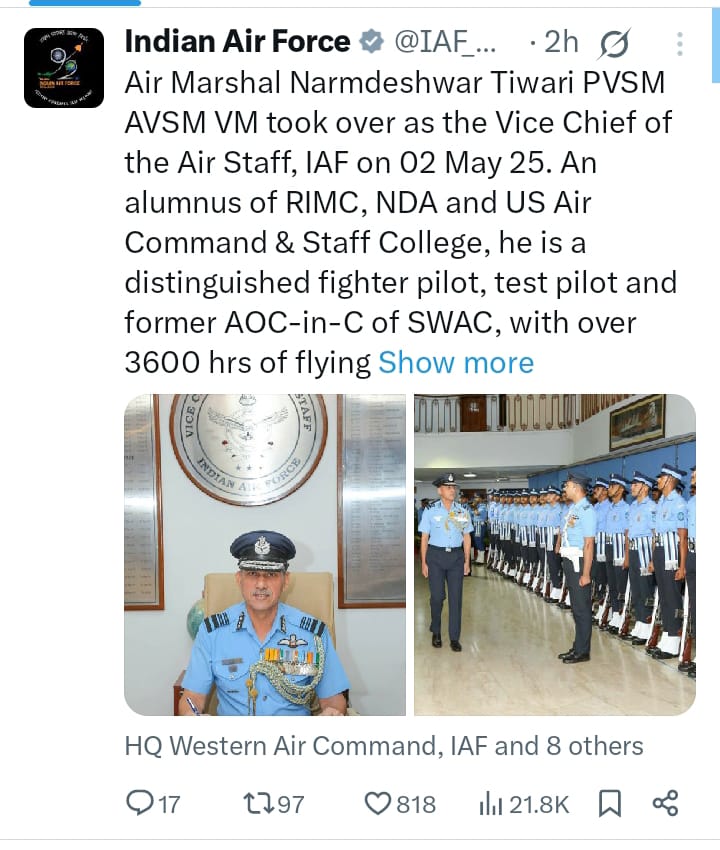 भारतीय वायु सेना ने एक्स (पूर्व में ट्विटर) पर जानकारी साझा करते हुए कहा, “परम विशिष्ट सेवा मेडल (PVSM), अति विशिष्ट सेवा मेडल (AVSM), और वायु सेना मेडल (VM) से सम्मानित एयर मार्शल नर्मदेश्वर तिवारी ने 2 मई 2025 को उप वायु सेना प्रमुख का पदभार संभाल लिया है।”