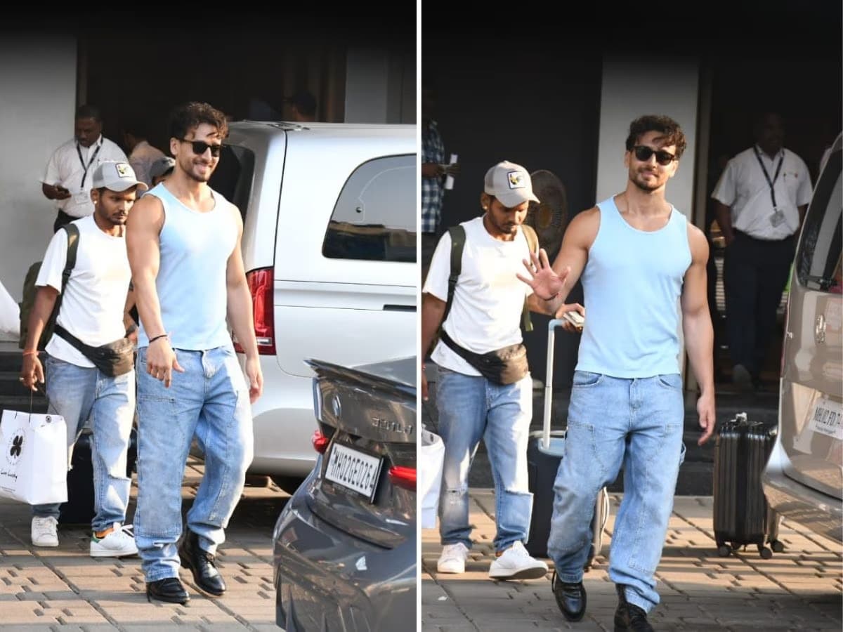 फिल्म ‘बड़े मियां छोटे मियां’ के प्रमोशन के लिए निकले टाइगर श्रॉफ को सफेद स्लीवलेस टी-शर्ट और ब्लू डेनिम पहने देखा गया. उन्होंने काला चश्मा पहन रखा था.