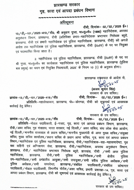Anurag Gupta becomes DGP of Jharkhand DGP notification issued अधिसूचना जारी अनुराग गुप्ता बने झारखंड के DGP