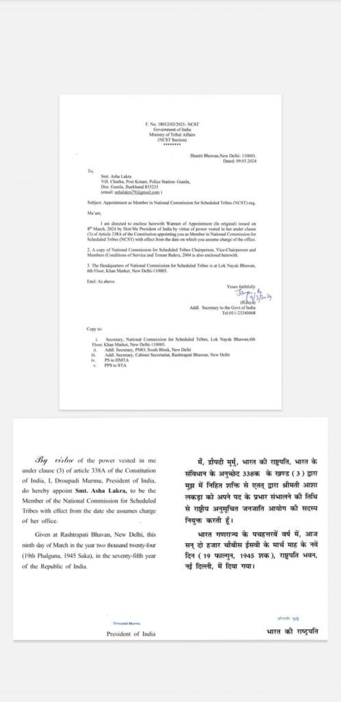 राष्ट्रपति द्रौपदी मुर्मू की अनुशंसा के बाद मिनिस्ट्री ऑफ ट्राइबल अफेयर्स के एनसीएसटी सेक्शन की ओर से शनिवार को इस संबंध में पद जारी किया. यह पद केंद्रीय राज्य मंत्री के समकक्ष है. वर्तमान में डा आशा लकड़ा भाजपा पश्चिम बंगाल की सह प्रभारी हैं. झारखंड में सशक्त आदिवासी महिला के रूप में उभरी डा. आशा लकड़ा के कार्यक्षेत्र व आम लोगों के बीच उनकी अलग पहचान को लेकर केंद्रीय भाजपा कमेटी ने उन्हें राष्ट्रीय कमेटी में राष्ट्रीय मंत्री पद की जिम्मेदारी दी. 2022 में उन्हें देश के कई राज्यों में चुनावी रणनीति तैयार करने की जिम्मेदारी दी गई थी, जिसमें उन्होंने अपनी सक्रियता दिखाई थी. छत्तीसगढ़, असम, पश्चिम बंगाल व गोवा में विधानसभा चुनाव के दौरान उन्होंने अपनी सूझबूझ व राजनीतिक परिपक्वता से भाजपा को बढ़त दिलाई. अब केंद्र सरकार ने उन्हें नई जिम्मेदारी दी है. झारखंड में आदिवासियों के शोषण के विरुद्ध उन्होंने मुखर होकर राज्य सरकार के समक्ष अपनी बातें रखीं, जिस पर सरकार खामोश रही. आदिवासियों पर हो रहे अत्याचार, मानसिक उत्पीड़न, दुष्कर्म आदि से संबंधित मामलों में भी उन्होंने अपनी आवाज बुलंद की. उन्होंने कहा कि कोई भी काम छोटा या बड़ा नहीं होता है. सच्ची लगन, मेहनत व ईमानदारी से किए गए काम का ही प्रतिफल है कि अखिल भारतीय विद्यार्थी परिषद की राष्ट्रीय अध्यक्ष बनी. इसके बाद नई-नई जिम्मेदारी मिली, जिसे अपना कर्तव्य मानकर आगे बढ़ी. अब इस नई जिम्मेदारी को भी बेहतर ढंग से पूरा करने का प्रयास करूंगी.