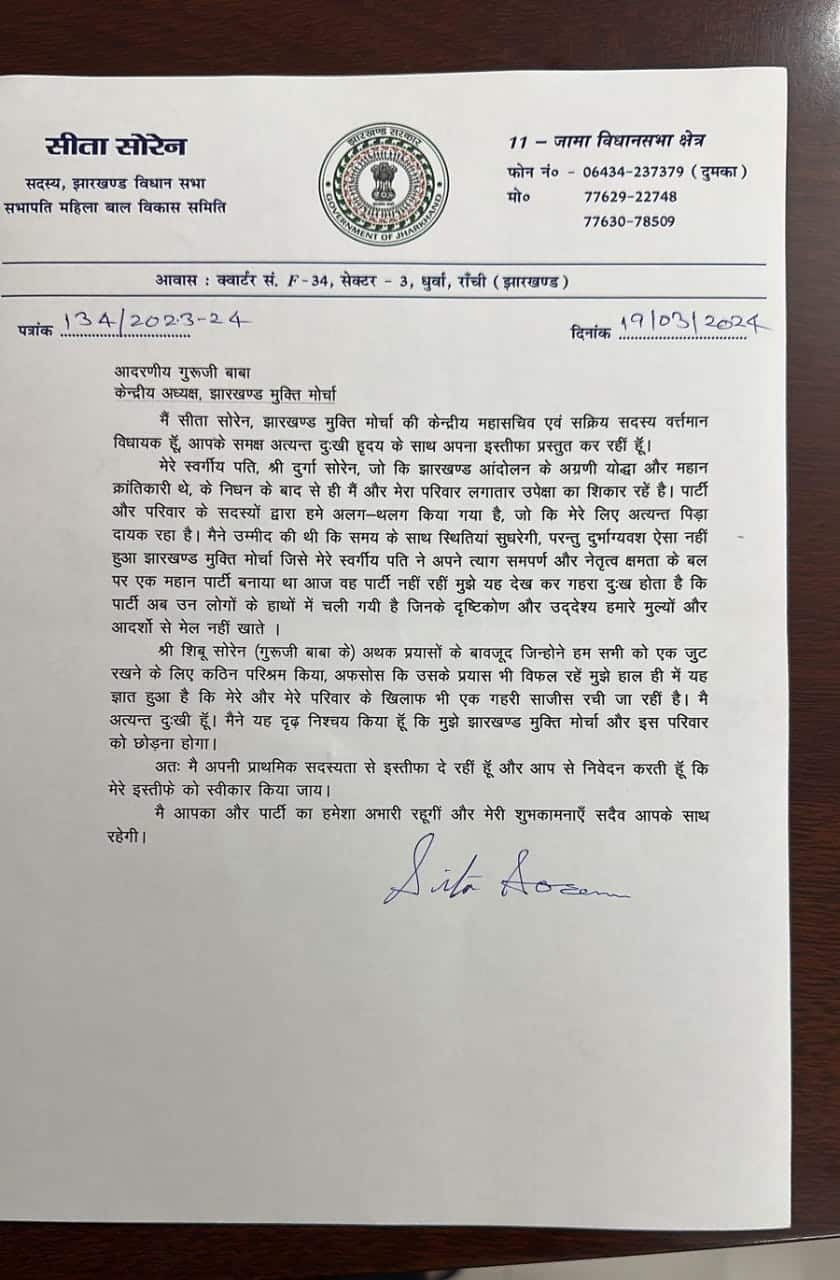 उन्होंने पत्र में लिखा है कि ‘मैं सीता सोरेन, झारखण्ड मुक्ति मोर्चा की केन्द्रीय महासचिव एवं सक्रिय सदस्य वर्त्तमान विधायक हूँ, आपके समक्ष अत्यन्त दुःखी हृदय के साथ अपना इस्तीफा प्रस्तुत कर रहीं हूँ. मेरे पति दुर्गा सोरेन, जो कि झारखण्ड आंदोलन के अग्रणी योद्धा और महान क्रांतिकारी थे, उनके निधन के बाद से ही मैं और मेरा परिवार लगातार उपेक्षा का शिकार रहें है. पार्टी और परिवार के सदस्यों द्वारा हमे अलग-थलग किया गया है, जो कि मेरे लिए अत्यन्त पीड़ादायक रहा है. मैने उम्मीद की थी कि समय के साथ स्थितियां सुधरेगी, परन्तु दुर्भाग्यवश ऐसा नहीं हुआ. झारखण्ड मुक्ति मोर्चा को मेरे पति ने अपने त्याग समपर्ण और नेतृत्व क्षमता के बल पर एक महान पार्टी बनाया था, आज वह पार्टी नहीं रहीं मुझे यह देख कर गहरा दुःख होता है कि पार्टी अब उन लोगों के हाथों में चली गयी है जिनके दृष्टिकोण और उद्देश्य हमारे मुल्यों और आदर्शों से मेल नहीं खाते .