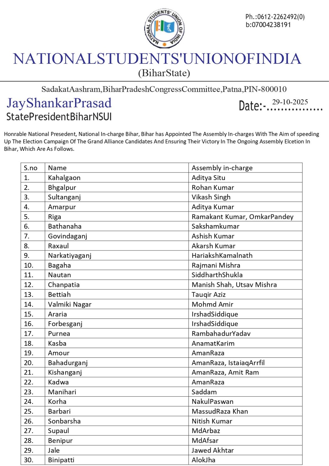 यह सूची NSUI बिहार के अध्यक्ष जयशंकर प्रसाद की ओर से जारी की गई है। इनके अनुसार, हर प्रभारी का काम महागठबंधन के उम्मीदवारों के प्रचार में तेजी लाना और चुनाव जीतने में मदद करना होगा। यह कदम विशेष रूप से छात्र और युवा वोटरों को जोड़ने के उद्देश्य से उठाया गया है।