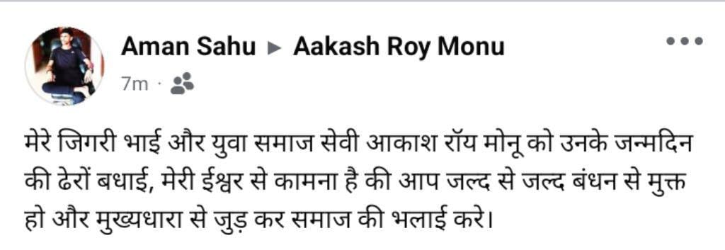 Ranchi : गैंगस्टर अमन साहू ने अपने खास आकाश रॉय मोनू को फेसबुक पर उसे उसके जन्मदिन की बधाई दी है, ये पोस्ट 23 जनवरी की मध्य रात्रि मे की गयी है। इस पोस्ट मे लिखा है “मेरे जिगरी भाई और युवा समाज सेवी आकाश रॉय मोनू को उनके जन्मदिन की ढेरों बधाई, मेरी ईश्वर से कामना है की आप जल्द से जल्द बंधन से मुक्त हो और मुख्यधारा से जुड़ कर समाज की भलाई करे।” हालांकि इस पोस्ट में कितना दम है, इसका आधिकारिक तौर पर कोई खुलासा नहीं हो पाया है।
