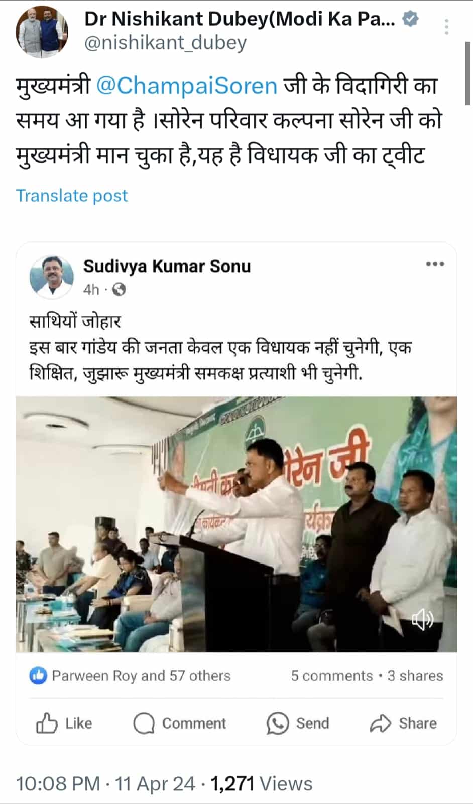 इतना ही नहीं, बीजेपी सांसद निशिकांत दुबे ने सीएम चंपाई सोरेन पर भी निशाना साधा है. उन्होंने एक्स पर पोस्ट कर कहा है कि पिछले दो दिन से झारखंड के मुख्यमंत्री चंपाई सोरेन किसी सरकारी या पार्टी के कार्यक्रम में नजर नहीं आ रहे हैं. सूचना के अनुसार पूर्व मुख्यमंत्री हेमंत सोरेन ने उन्हें कल्पना सोरेन के लिए मुख्यमंत्री पद छोड़ने का फरमान जारी किया है. सीता सोरेन, लोबिन हेंब्रम व चमरा लिंडा ने निर्णय ले लिया है. खेला होबे ?