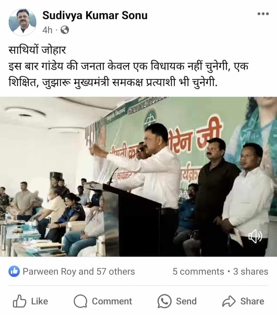 दरअसल, JMM नेता सुदिव्य कुमार सोनू ने अपने FACEBOOK पर एक पोस्ट डाला है. जिसमें उन्होंने लिखा है कि साथियों जोहार, इस बार गांडेय की जनता केवल एक विधायक नहीं चुनेगी, एक शिक्षित, जुझारू मुख्यमंत्री समकक्ष प्रत्याशी भी चुनेगी. इसी पोस्ट पर बीजेपी सांसद निशिकांत दुबे ने चुटकी ली.