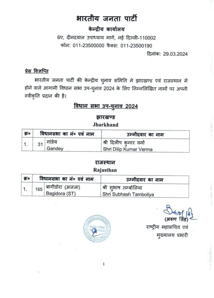 बीजेपी ने विस उपचुनाव को लेकर जारी की उम्मीदवारों की सूची, गांडेय से दिलीप कुमार वर्मा लड़ेंगे चुनाव