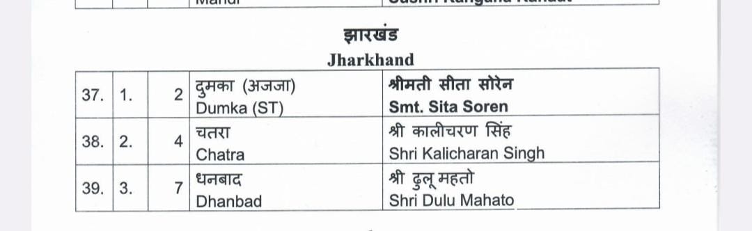 बीजेपी ने जारी की लोकसभा उम्मीदवारों की लिस्ट, ढुल्लू महतो धनबाद, सीता सोरेन दुमका से लड़ेंगी चुनाव