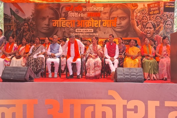 Ranchi : झारखंड में नारी शक्ति वंदन अधिनियम को लेकर भाजपा ने शनिवार को राजधानी रांची में महिला आक्रोश मार्च निकाला। मोरहाबादी मैदान से बड़ी संख्या में महिलाएं सड़कों पर उतरीं और जेएमएम, कांग्रेस और राजद के खिलाफ जमकर नारेबाजी की। आक्रोश मार्च से पहले मोरहाबादी मैदान के पास एक जनसभा का आयोजन किया गया। इसके बाद यह मार्च अल्बर्ट एक्का चौक तक निकाला गया। चिलचिलाती धूप के बावजूद राज्य के अलग-अलग जिलों से आईं महिलाएं इस प्रदर्शन में शामिल रहीं।