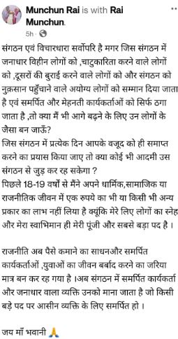रांची: बीजेपी पार्टी की पहली सूची निकलने के बाद भाजपा का सक्रिय कार्यकर्ता काफी निराश नज़र आ रहे है. कोई अपनी मन की बात सोशल मीडिया में तो आम जनता के बीच रहकर भड़ास निकाल रहे है. रांची विधानसभा के एक सक्रिय भाजपा कार्यकर्ता मुनचुन राय ने सोशल मीडिया में अपनी मन की भड़ास निकाला है.