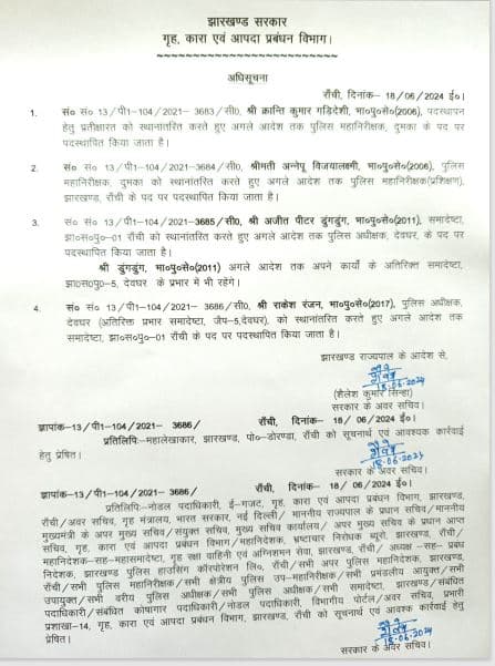 रांची : राज्य सरकार ने चुनाव के बाद 4 आईपीएस का तबादला किया है. अजित पीटर डुंगडुंग को फिर से देवघर का एसपी बनाया गया है.