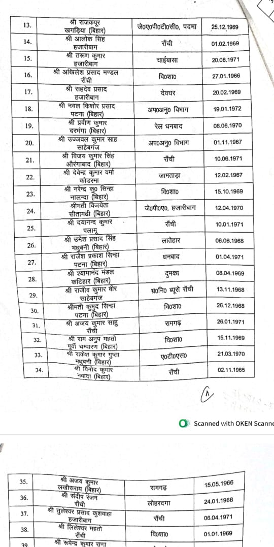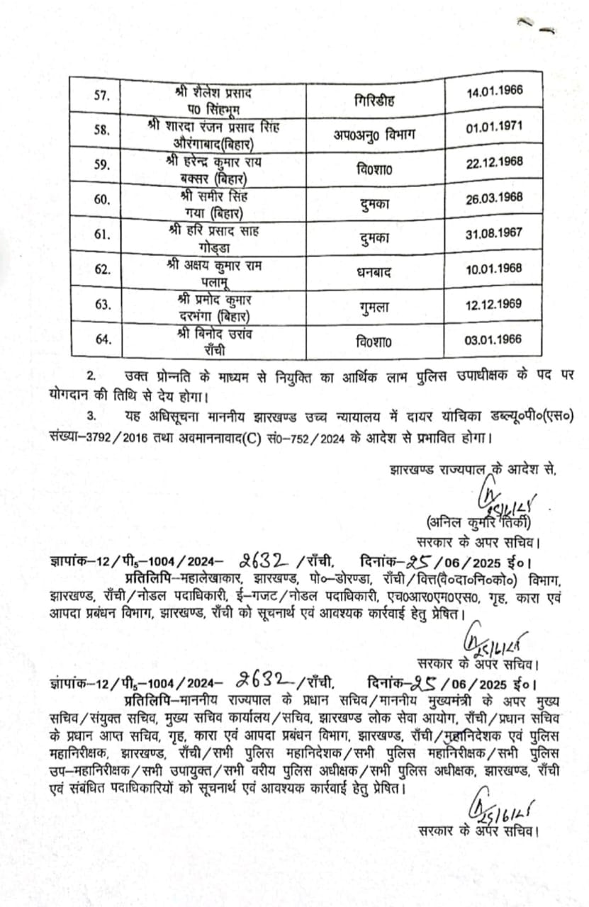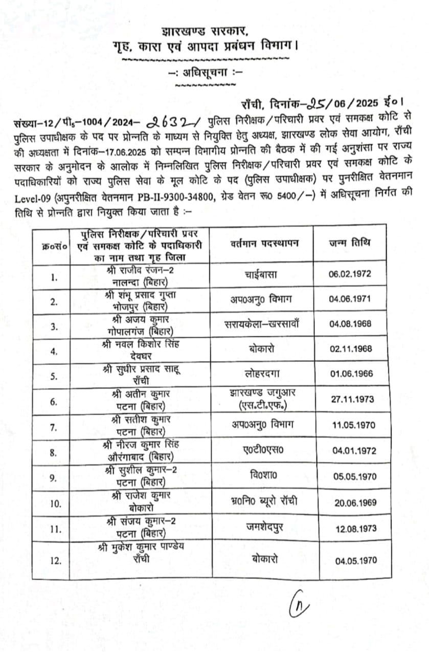Share Facebook Twitter Telegram WhatsApp Email Copy Link Ranchi : झारखंड में इंस्पेक्टर रैंक के अधिकारियों का प्रमोशन किया गया है। 64 अधिकारियों को DSP बना दिया गया है। संबंधित अधिसूचना गृह, कारा एवं आपदा प्रबंधन विभाग की ओर से जारी कर दिया गया है। कौन-कौन से अधिकारी DSP बनाए गए हैं… देखें लिस्ट