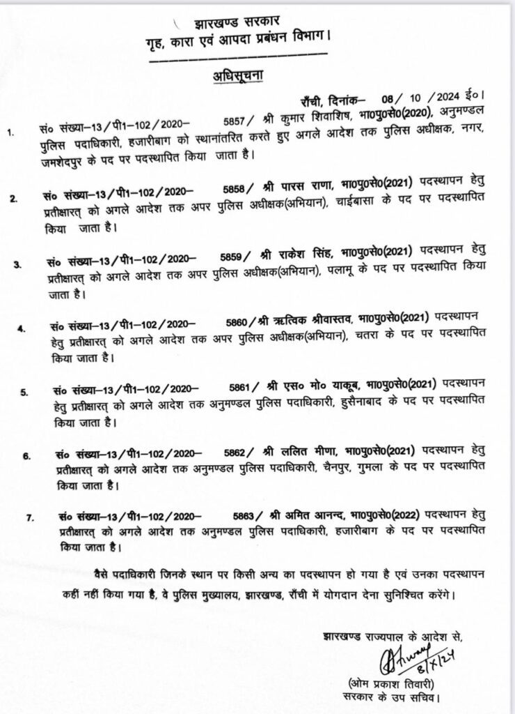 रांची: विधानसभा चुनाव से पूर्व राज्य सरकार ने सात आईपीएस स्तर के अधिकारी का तबादला किया है. कुमार शिवाशिष कुमार को जमशेदपुर सिटी एसपी बने है.