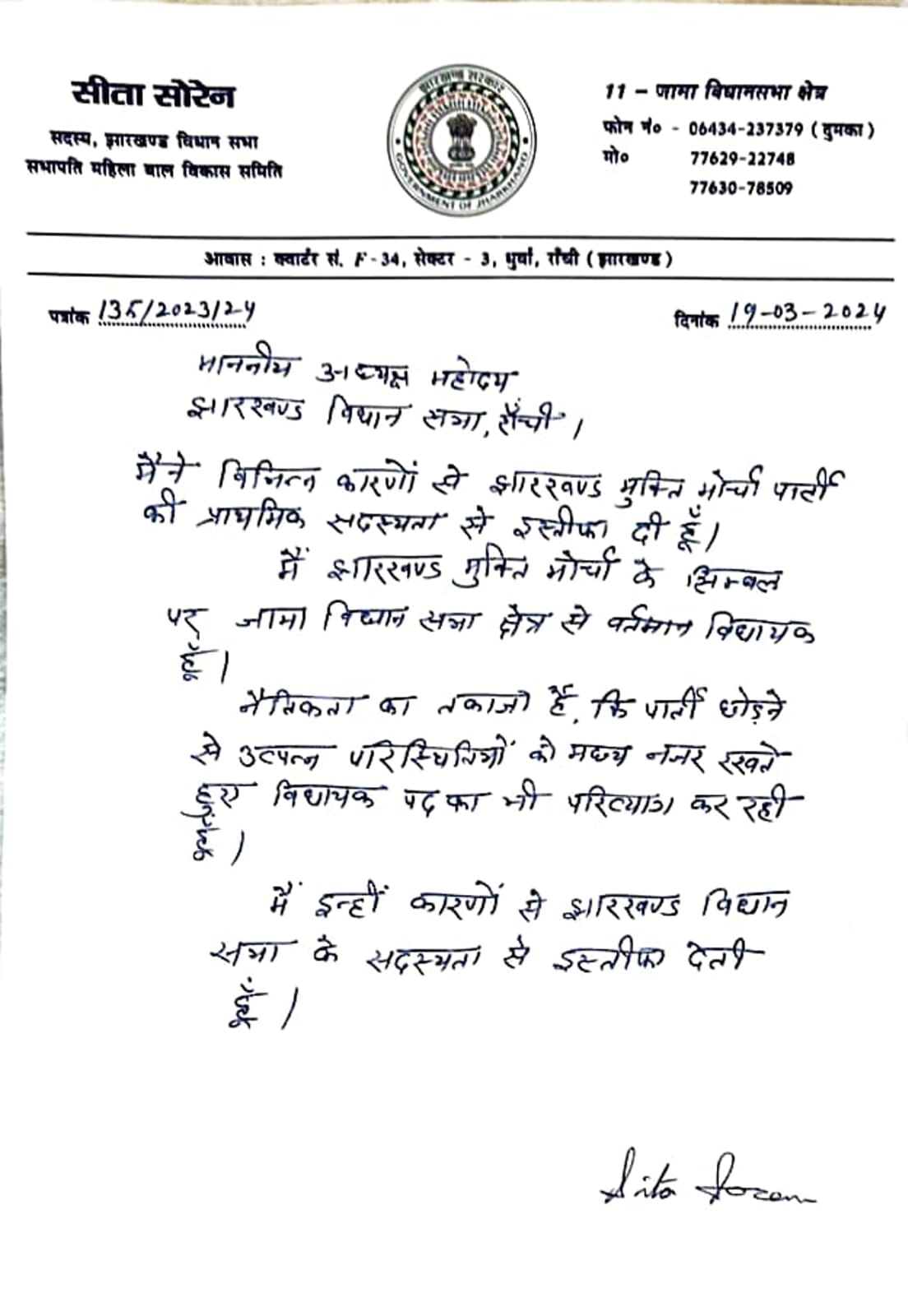 रांची: जेएमएम के सभी पदों से इस्तीफा देने के बाद जामा विधायक सीता सोरेन ने विधायक पद से भी इस्तीफा दे दिया है. झारखंड के स्पीकर के नाम पत्र लिख कर सीता सोरेन ने विधायकी से इस्तीफा दिया है. उन्होंने पत्र में कहा कि मैंने विभिन्न कारणों से झारखंड मुक्ति मोर्चा पार्टी की प्राथमिक सदस्यता से इस्तीफा दे दिया है. उन्होंने आगे लिखा कि नैतिकता का तकाजा है कि पार्टी छोड़ने से उत्पन्न परिस्थितियों को मद्देनजर रखते हुए विधायक पद का भी परित्याग कर रही हूं. मैं इन्हीं कारणों से झारखंड विधानसभा के सदस्यता से इस्तीफा देती हूं.