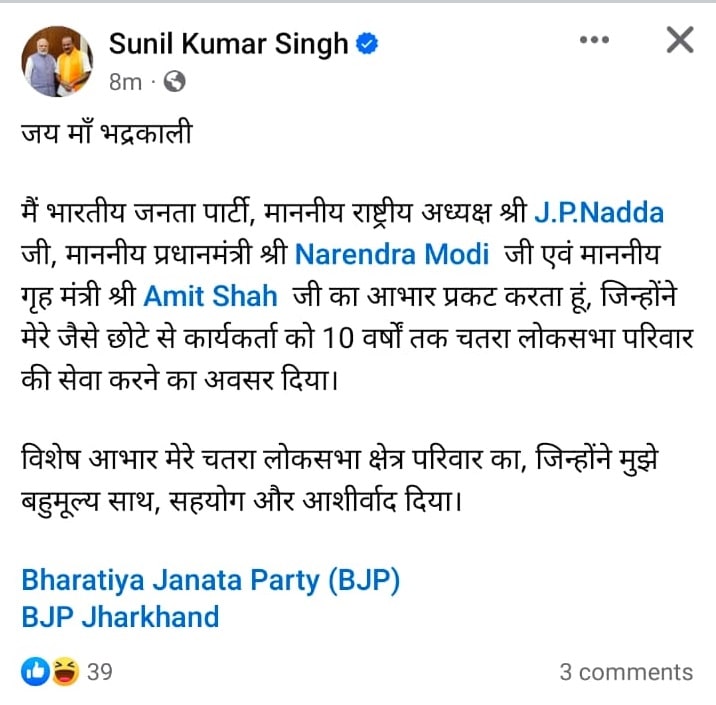 उन्होंने लिखा है कि बीते दस वर्षों तक चतरा की जनता का सेवा करने का मौका देने के लिए प्रधानमंत्री नरेंद्र मोदी, पार्टी अध्यक्ष जेपी नड्डा, अमित शाह को धन्यवाद दिया है. साथ ही उन्होंने चतरा की जनता का विशेष आभार व्यक्त किया है. इस पोस्ट के साथ ही, यह साफ हो गया है कि उन्होंने खुद को लोकसभा चुनाव के लिए उम्मीदवारी के रेस से बाहर कर लिया है. दरअसल ऐसे ही पोस्ट के जरिये कुछ दिनों पहले हजारीबाग सांसद जयंत सिन्हा ने भी खुद को उम्मीदवारी के रेस से बाहर कर लिया था. इन सब के बीच अब चर्चा का विषय बना हुआ है कि चतरा को लेकर अगला उम्मीदवार कौन हो सकता है. बीजेपी किसको चतरा लोकसभा सीट से उम्मीदवार बनायेगी.