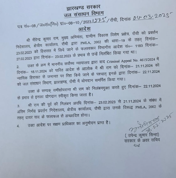 Ranchi : झारखंड के ग्रामीण विकास विभाग के निलंबित इंजीनियर इन चीफ वीरेंद्र राम का सस्पेंशन खत्म कर दिया गया है। संबंधित अधिसूचना जल, संसाधन विभाग की ओर से जारी कर दिया गया है। वीरेंद्र राम अब जल संसाधन विभाग में योगदान देंगे।