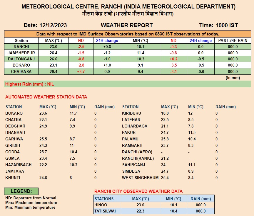 राजधानी रांची की बात करें तो राजधानी का मौसम 16 दिसंबर तक शुष्क रहेगा. इस दौरान सुबह और शाम लोगों को कोहरा का सामना करना पड़ेगा. लेकिन सुबह के बाद से ही धूप निकलेगी. ऐसे में दिन के समये थोड़ी राहत मिल सकती है. हालांकि ठंडी हवाओं के कारण लोगों को सर्तक रहने की जरूरत है.