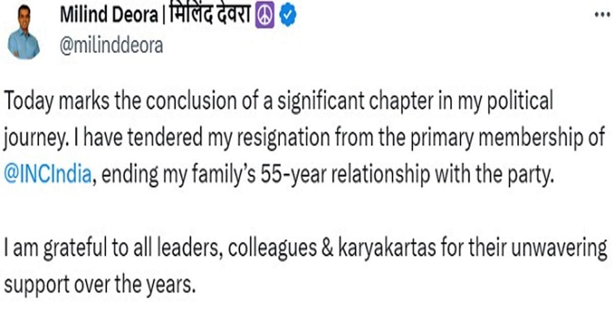 मिलिंद देवड़ा ने एक्स पर लिखा- ‘आज मेरी राजनीतिक यात्रा में एक महत्वपूर्ण अध्याय का समापन हुआ. मैंने कांग्रेस की प्राथमिक सदस्यता से अपना इस्तीफा दे दिया है. पार्टी के साथ मेरे परिवार का 55 साल पुराना रिश्ता खत्म हो गया है.’