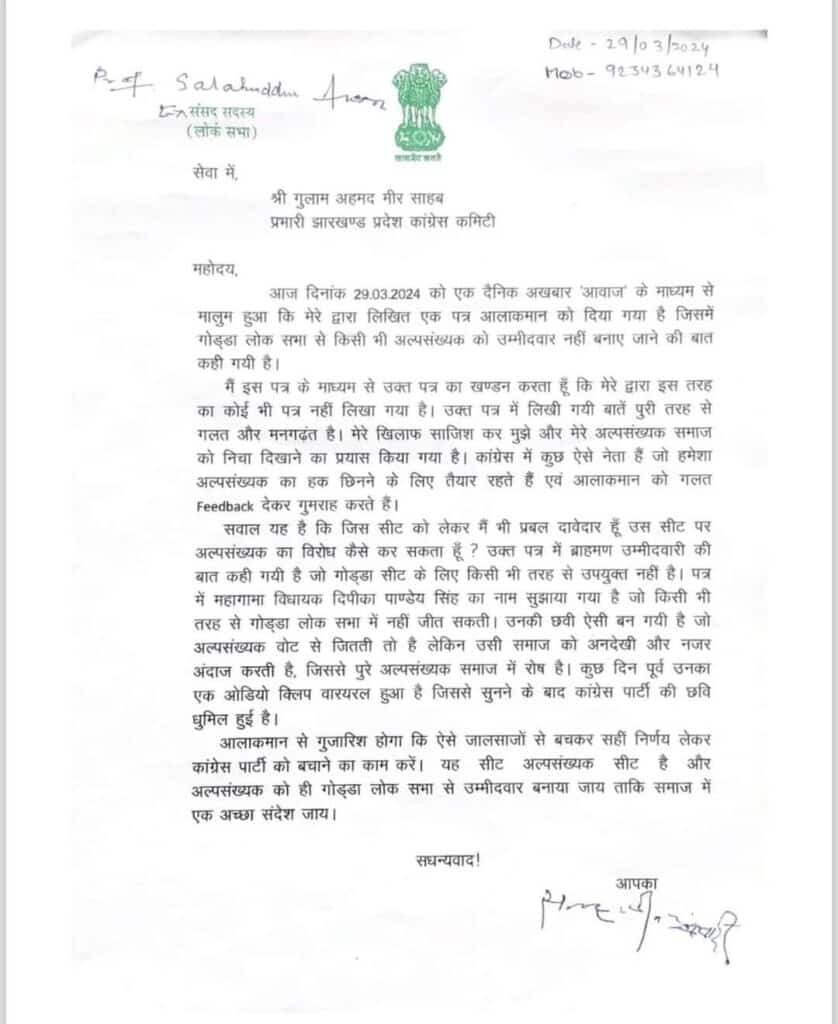 रांची : गोड्डा लोकसभा सीट को लेकर कांग्रेस आपस में भीड़ गई है. दोनों विधायक एक-दूसरे पर आरोप प्रत्यारोप लगा रहे है. यही कारण है कि अभी तक गोड्डा सीट को लेकर कांग्रेस ने नाम का खुलासा नहीं किया है. वहीं दूसरी ओर बीजेपी ने इस सीट पर चौथी बार निशिकांत दूबे को अपना उम्मीदवार बनाया है. निशिकांत दूबे बीजेपी के टिकट पर चुनाव लड़ने जा रहे है. कांग्रेस की ओर से गोड्डा सीट पर उम्मीदवार कौन होगा, इसको लेकर अटकलों का बाजार गर्म है. इसी बीच सोशल मीडिया पर एक चिट्ठी जोर शोर से वायरल हो रही है. यह चिट्ठी जामताड़ा विधायक इरफान अंसारी का लिखा हुआ बताया जा रहा है. चिट्ठी में जो बातें लिखी है, उससे महगामा विधायक दीपिका पांडेय सिंह की छवि धूमिल कर रही है. विधायक दीपिका पांडेय पर कई गंभीर सवाल भी खड़े कर रही है.