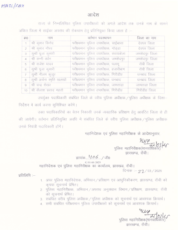 Ranchi : झारखंड में बढ़ते साइबर अपराध को देखते हुए विभिन्न जिलों में 10 DSP की तैनाती हुई है. इसमें देवघर जिला को 2, रांची जिला को 2, धनबाद जिला को 2, जमशेदपुर जिला को 2 और जामताड़ा व गिरिडीह जिला को 1-1 DSP मिला है. इससे संबंधित अधिसूचना शनिवार को जारी कर दी गई है. देखें पूरी लिस्ट.