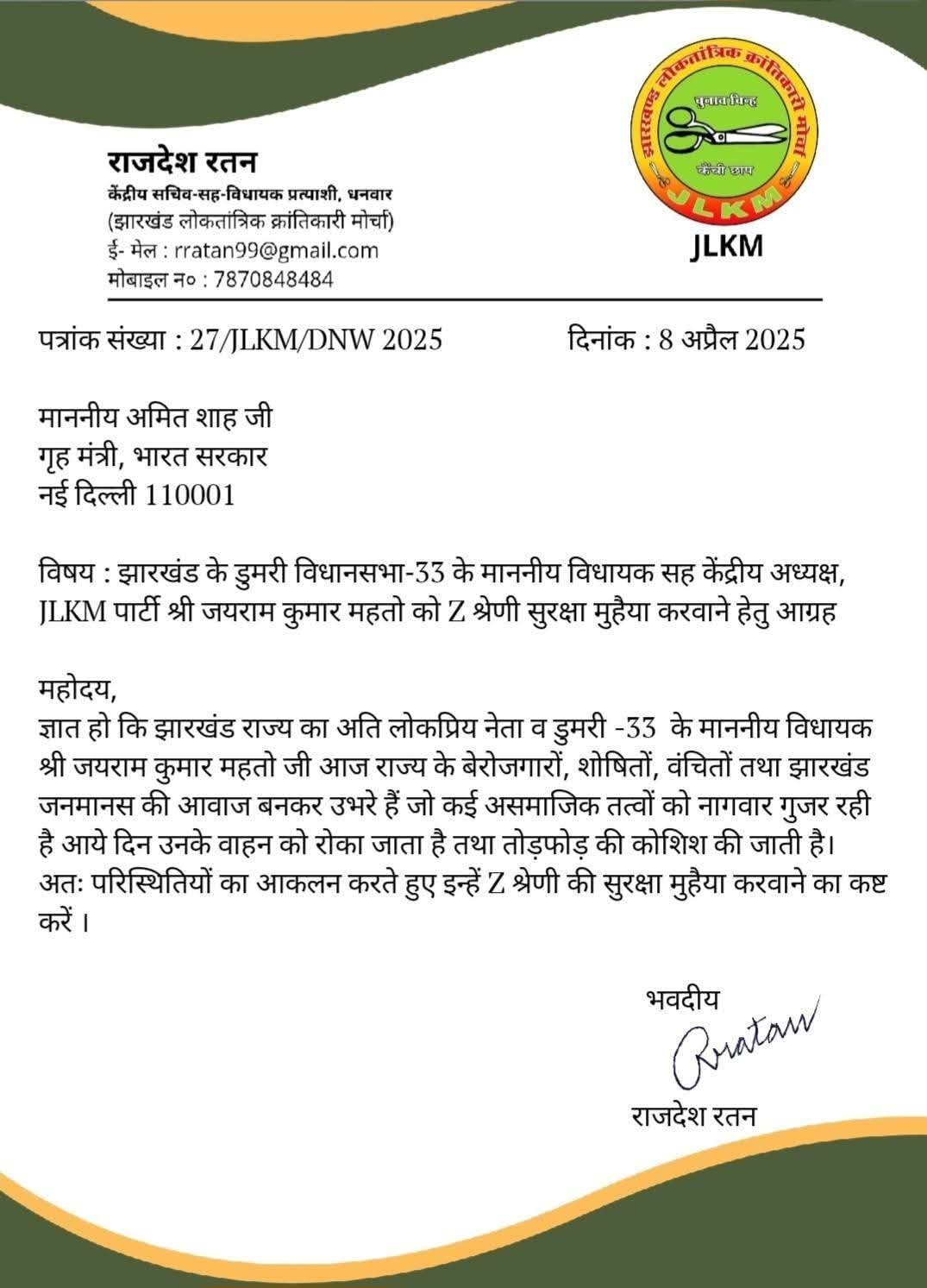 झारखंड: झारखंड लोकतांत्रिक क्रांतिकारी मोर्चा (JLKM) के केंद्रीय सचिव व सह-विधानसभा प्रत्याशी राजदेश रतन ने भारत सरकार के गृह मंत्री अमित शाह को पत्र लिखकर डुमरी-33 विधानसभा क्षेत्र के लोकप्रिय विधायक जयराम कुमार महतो को Z श्रेणी की सुरक्षा मुहैया कराने की मांग की है। राजदेश रतन ने पत्र में उल्लेख किया है कि जयराम महतो वर्तमान समय में झारखंड के बेरोजगारों, शोषितों, वंचितों तथा राज्य की जनता की आवाज बनकर उभरे हैं। उनकी लोकप्रियता और जनसमर्थन को देखते हुए वे असामाजिक तत्वों के निशाने पर हैं। पत्र में यह भी बताया गया है कि महतो के काफिले को अक्सर रोका जाता है और तोड़फोड़ की कोशिशें की जाती हैं।