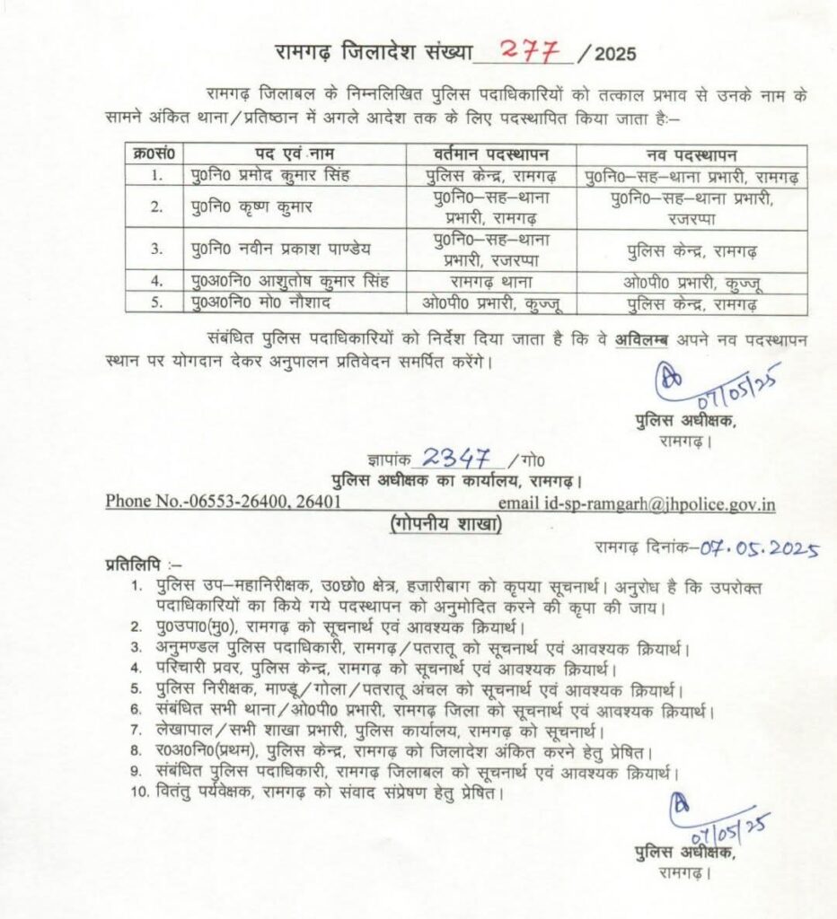 Ramgarh : रामगढ़ में पांच पुलिस अधिकारियों को इधर से उधर किया गया है। इनमें तीन इंस्पेक्टर और दो सब इंस्पेक्टर रैंक के अधिकारी हैं। एनकाउंटर स्पेशलिस्ट इंस्पेक्टर प्रमोद कुमार सिंह को रामगढ़ का नया थानेदार बनाया गया है।