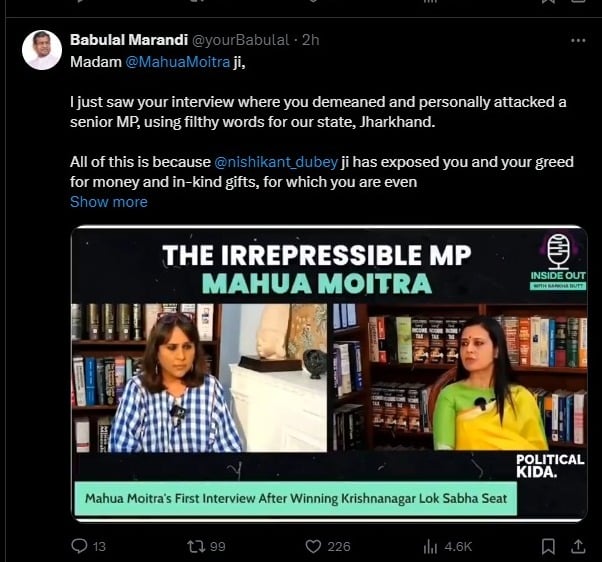 रांची : टीएमसी सांसद महुआ मोइत्रा के झारखंडियों पर किये गये अपमानजनक टिप्पणी से भाजपा के प्रदेश अध्यक्ष बाबूलाल मरांडी काफी नाराज हैं. महुआ मोइत्रा ने अपने एक इंटरव्यू में झारखंडियों पर अपमानजनक टिप्पणी की है. इस इंटरव्यू को महुआ मोइत्रा ने 10 जून को अपने ऑफिशियल ट्विटर (एक्स) पर पोस्ट किया था. चार दिन बार बाबूलाल मरांडी ने महुआ के ट्विट पर रिप्लाई करते हुए लिखा कि ‘’मैंने अभी-अभी आपका इंटरव्यू देखा, जिसमें आपने हमारे राज्य झारखंड के लिए गंदे शब्दों का इस्तेमाल करते हुए एक वरिष्ठ सांसद का अपमान किया और उन पर व्यक्तिगत हमला किया. यह सब इसलिए हुआ क्योंकि सांसद निशिकांत दुबे ने आपको और आपके पैसे और उपहारों के लालच को उजागर किया है, जिसके लिए आप देश की संवेदनशील जानकारी बेचने को भी तैयार हैं.‘’