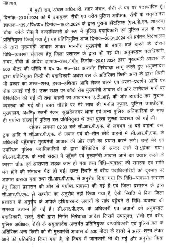रांची: सीएम आवास में 20 जनवरी को ईडी की पूछताछ के दिन सड़क जाम करने को लेकर मैजिस्ट्रेट के बयान पर तीन अलग-अलग एफआईआर गोंदा में दर्ज की गईं हैं. जिसमें एक एफआईआर सीआरपीएफ के जवानों, उनके आइजी आदि पर हुई है. वहीं उनपर गैरजमानती धारा लगा है. शेष दो प्राथमिकियों में एक झामुमो के सैकड़ों कार्यकर्ताओं व दूसरी भीम आर्मी के पदाधिकारियों पर दर्ज कराई गई है. इन दोनों एफआईआर में गैर जमानती धारा नहीं लगा है. सीआरपीएफ के जवानों व उनके पदाधिकारियों पर दर्ज एफआईआर में यह जिक्र है कि सीआरपीएफ के जवान गैरकानूनी तरीके से सीएम आवास में प्रवेश करना चाहते थे. सीआरपीएफ़ अधिकारी व जवानों पर धारा-143,188,353 तहत मामला दर्ज हुआ है. वहीं दो अन्य केस में धारा-143,188 के तहत मामला दर्ज किया गया. सीआरपीएफ़ और भीम आर्मी पर शहर सीओ मुंशी राम ने मामला दर्ज कराया है जबकि जेएमएम कार्यकर्ता पर कांके सीओ जय कुमार राम ने मामला दर्ज कराया है.