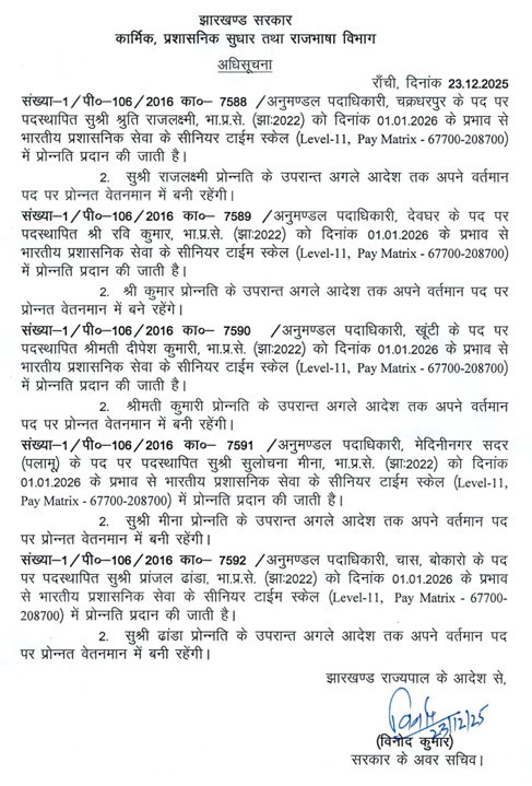Ranchi : झारखंड सरकार ने IAS यानी भारतीय प्रशासनिक सेवा के पांच अधिकारियों को सीनियर टाइम स्केल में पदोन्नति देने का निर्णय लिया है। कार्मिक, प्रशासनिक सुधार एवं राजभाषा विभाग की ओर से जारी अधिसूचना के अनुसार यह प्रोन्नति 1 जनवरी 2026 से प्रभावी होगी। इसके तहत अधिकारियों को Level-11 वेतनमान में रखा गया है, जिसमें 67,700 रुपये से लेकर 2,08,700 रुपये तक वेतन निर्धारित है। प्रमोशन पाने वाले अधिकारियों में चक्रधरपुर की एसडीओ श्रुति राजलक्ष्मी, देवघर के एसडीओ रवि कुमार, खूंटी की एसडीओ दीपेश कुमारी, मेदिनीनगर सदर पलामू की एसडीओ सुलोचना मीना और चास बोकारो के एसडीओ प्रांजल ढांडा शामिल हैं। ये सभी अधिकारी झारखंड कैडर के 2022 बैच से संबंधित हैं।