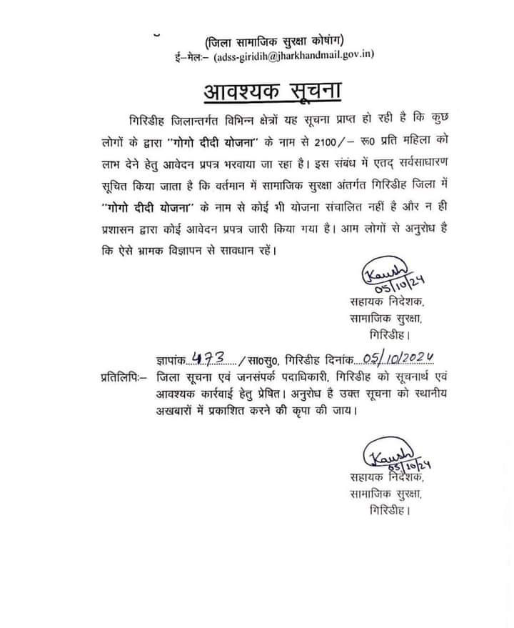 गिरिडीह: आगामी विधानसभा चुनाव से पूर्व भाजपा पार्टी ने राज्यभर की महिलाओं को प्रतिमाह 2100 देने की घोषणा की. इस घोषणा के तहत राज्यभर में “गोगो दीदी योजना” के तहत फॉर्म भरवाया जा रहा है. इसको लेकर गिरिडीह जिला प्रशासन ने एक चिट्ठी निकाला है, जिसमें स्पष्ट तौर पर लिखा है कि इस नाम से कोई योजना संचालित नहीं है. न ही प्रशासन द्वारा कोई आवेदन फॉर्म जारी किया गया है. आम जनता से आग्रह किया है कि ऐसे भ्रामक विज्ञापन से सावधान रहेंगे.