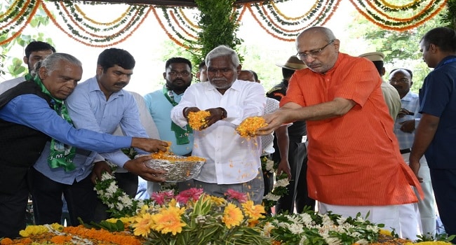 रांची : धरती आबा भगवान बिरसा मुंडा की पुण्यतिथि पर राज्यपाल सीपी राधाकृष्णन और मुख्यमंत्री चंपाई सोरेन ने पुराने जेल मोड़ स्थित तिमा पर माल्यार्पण कर श्रद्धांजलि अर्पित की. भगवान बिरसा मुंडा की पुण्यतिथि पर उनकी प्रतिमा पर माल्यार्पण करने के बाद मुख्यमंत्री चंपई सोरेन ने कहा कि भगवान बिरसा मुंडा ने साम्राज्यवाद के खिलाफ और जल, जंगल और जमीन के लिए काम किया. उन्होंने सबसे पहले बताया कि आदिवासियों को अपने हक के लिए कैसे आवाज उठानी चाहिए. उनके बताए मार्ग पर आज भी लोग चल रहे हैं. उनके संघर्ष के कारण ही जल, जंगल और जमीन की रक्षा के लिए सीएनटी और एसपीटी जैसे कानून बने. लोगों को बिरसा मुंडा के संघर्ष से प्रेरणा लेने की जरूरत है.