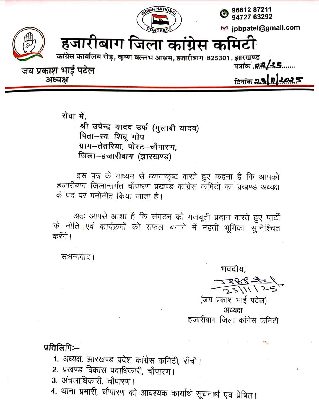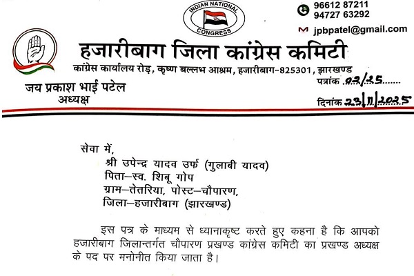 Hazaribagh :   चैथी पंचायत के मुखिया उपेन्द्र यादव उर्फ़ गुलाबी यादव को चौपारण प्रखंड कांग्रेस कमेटी का नया प्रखंड अध्यक्ष नियुक्त किया गया है। उनकी नियुक्ति का पत्र हजारीबाग जिला कांग्रेस कमेटी के अध्यक्ष जय प्रकाश भाई पटेल ने जारी किया।