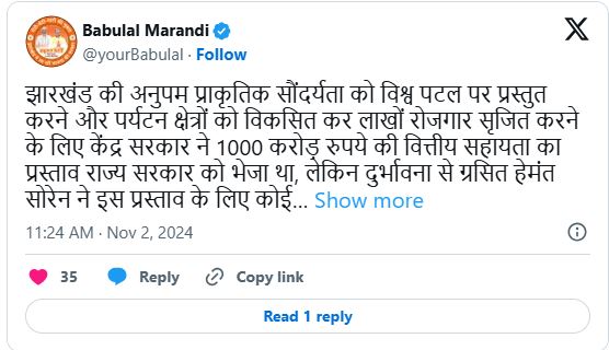 उन्होंने आगे बताया कि केंद्र सरकार ने देशभर के सभी राज्यों के लिए पर्यटन क्षेत्र को विकसित करने के लिए 1000 करोड़ रुपये की वित्तीय सहायता का प्रस्ताव दिया था, जिसमें राज्य सरकारों से योजनाएं मांगी गई थीं. लेकिन झारखंड सरकार ने इस प्रस्ताव के लिए कोई योजना नहीं भेजी, जो कि बेहद चिंताजनक है. मरांडी ने कहा कि इस प्रस्ताव के जरिए 10 हजार से अधिक युवाओं को रोजगार के अवसर मिलते और झारखंड के पर्यटन क्षेत्र में लगभग 15% की वृद्धि होती. उन्होंने हेमंत सोरेन की सरकार पर आरोप लगाया कि पिछले 5 वर्षों में ऐसी कई योजनाएं हैं जिन्हें राज्य सरकार ने केंद्र से मिलने वाली मदद को अपने अहंकार के चलते ठुकरा दिया है. उनका कहना था, “जहां एक ओर प्रतिवर्ष 5 लाख नौकरी के झूठे वादे युवाओं की कमर तोड़ रहे हैं, वहीं दूसरी ओर आपकी नकारात्मक राजनीति ने झारखंड के लाखों परिवारों को बेरोजगारी और भुखमरी का सामना करने को मजबूर कर दिया है.” बाबूलाल मरांडी ने हेमंत सोरेन पर निशाना साधते हुए कहा कि वह बांग्लादेशी घुसपैठियों को बसाने और अपने व्यक्तिगत लाभ में मशगूल हैं, जबकि झारखंड के विकास और भविष्य की परवाह नहीं कर रहे हैं। उन्होंने आश्वासन दिया कि जनता उचित सबक सिखाएगी.