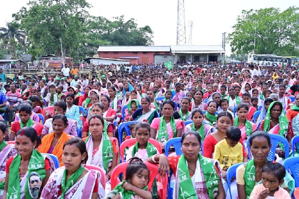 Adivasi rights Assam Assam Assembly Election election campaign news Hemant Soren Assam rally Hemant Soren speech Jharkhand Mukti Morcha JMM Assam election labour rights Assam Latest news Mathew Topno Mazbat rally news political rally Assam Preeti Rekha Barla Rangapara election rally tea garden workers Assam Today News Trending News tribal politics India