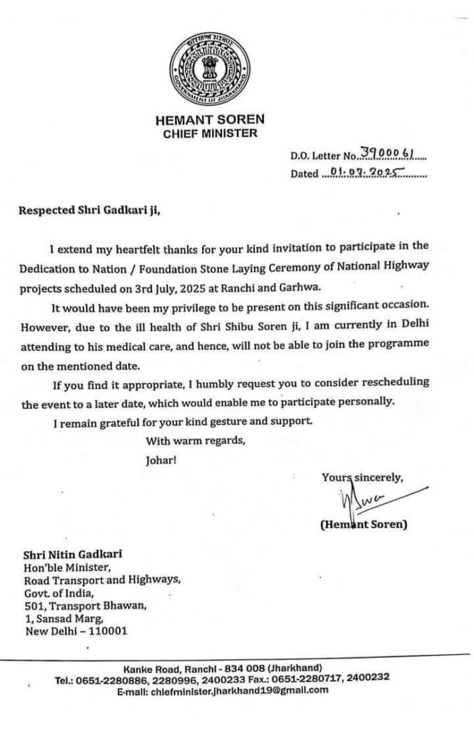पत्र में मुख्यमंत्री सोरेन ने गडकरी से अनुरोध किया है कि यदि उचित समझें तो कार्यक्रम की तारीख आगे बढ़ाने पर विचार करें ताकि वे स्वयं उसमें भाग ले सकें। उन्होंने पत्र के अंत में केंद्रीय मंत्री के सहयोग और सद्भाव के लिए आभार प्रकट किया और “जोहार” के अभिवादन के साथ पत्र समाप्त किया।