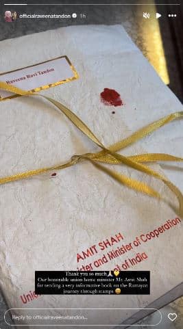 रवीना टंडन ने अपने इंस्टाग्राम स्टोरी पर लिखा, “टिकटों के माध्यम से रामायण यात्रा पर एक बहुत ही जानकारीपूर्ण पुस्तक भेजने के लिए हमारे माननीय केंद्रीय गृह मंत्री श्री अमित शाह को बहुत-बहुत धन्यवाद”.