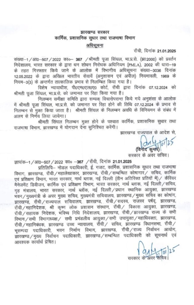 Ranchi : राज्य सरकार ने IAS पूजा सिंघल का निलंबन खत्म कर दिया है। मुख्य सचिव की अध्यक्षता में बनी कमेटी ने उन्हें निलंबन से मुक्त करने की अनुशंसा की थी। इस अनुशंसा पर पूजा सिंघल का निलंबन कार्मिक ने खत्म कर दिया। इस संबंध में कार्मिक, प्रशासनिक, सुधार तथा राजभाषा विभाग ने आदेश जारी कर दिया है। उन्हें कार्मिक में योगदान देने का निर्देश दिया गया है।