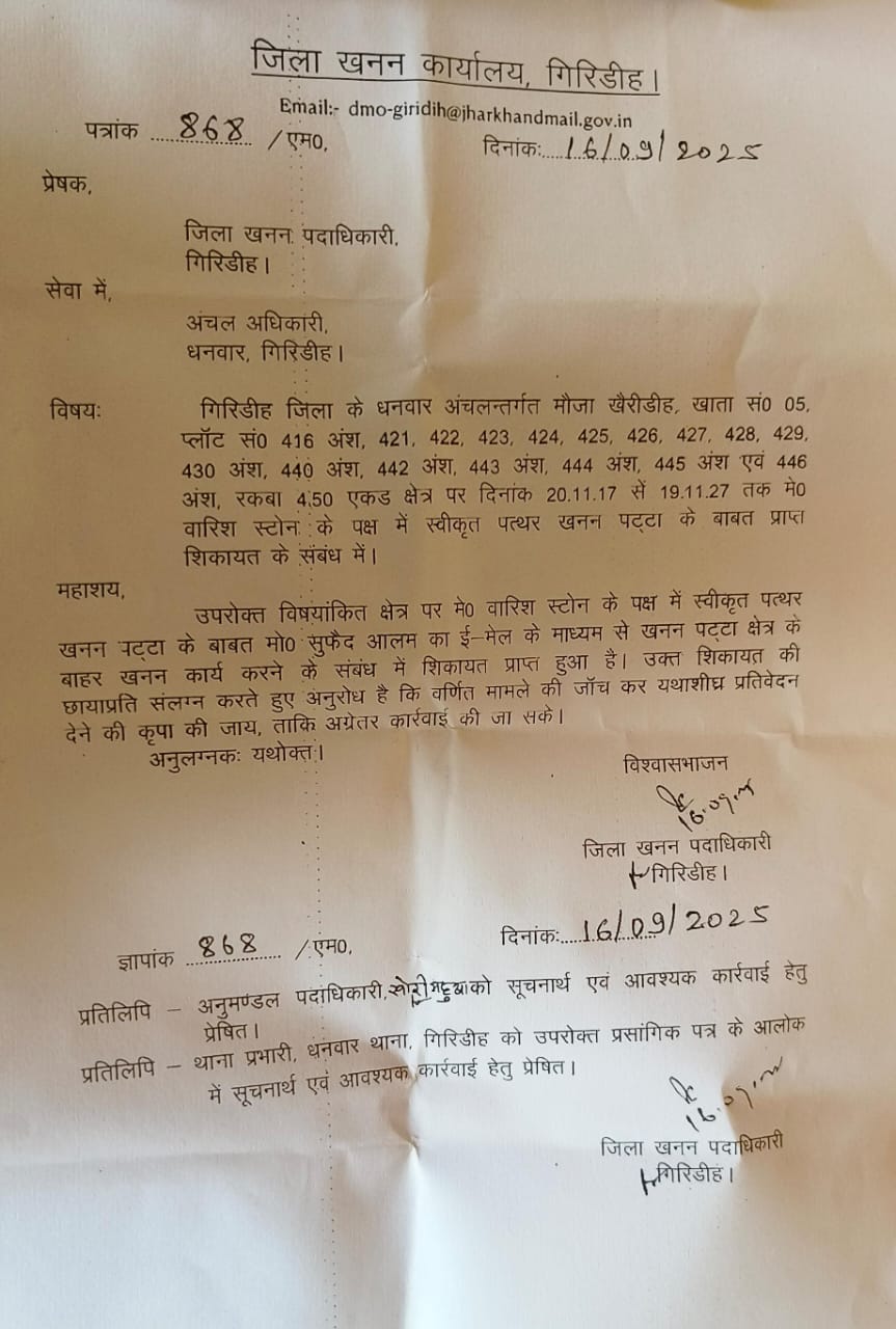 Giridih (Goswami Naresh Nath) : झारखंड के गिरिडीह जिले के राजधनवार थाना क्षेत्र के खेरीडीह गांव में अवैध पत्थर खनन का मामला सामने आया है। बताया जा रहा है कि यहां “वारिश स्टोन” नामक खदान में प्रतिबंध के बावजूद धड़ल्ले से खनन का काम किया जा रहा है। स्थानीय लोगों का आरोप है कि बार-बार शिकायत करने के बाद भी अवैध खनन रुकने का नाम नहीं ले रहा है।