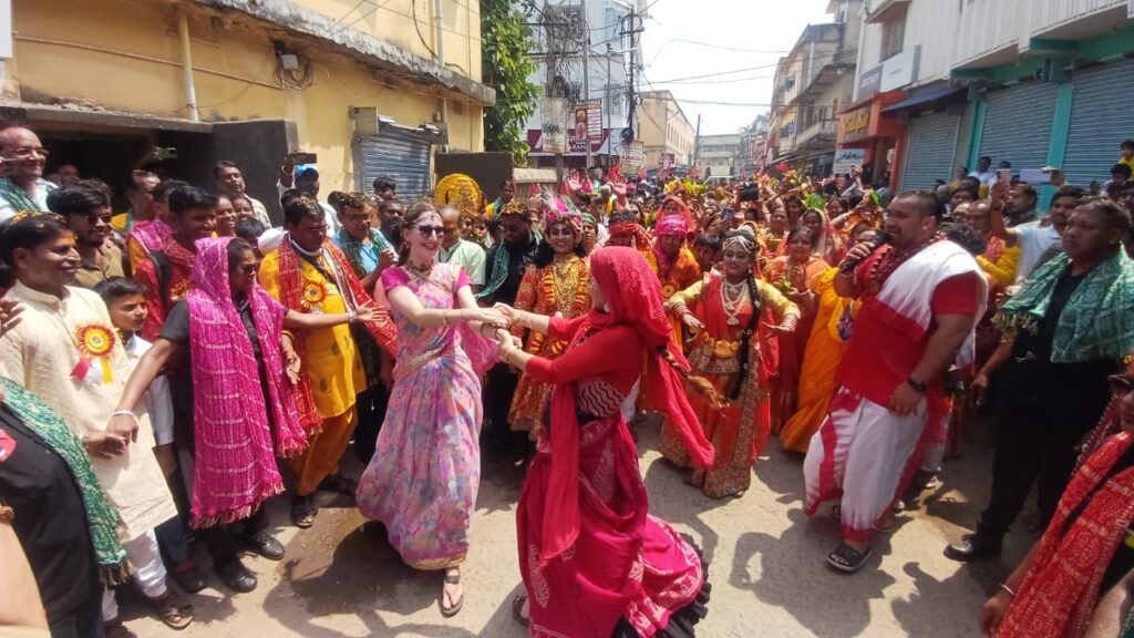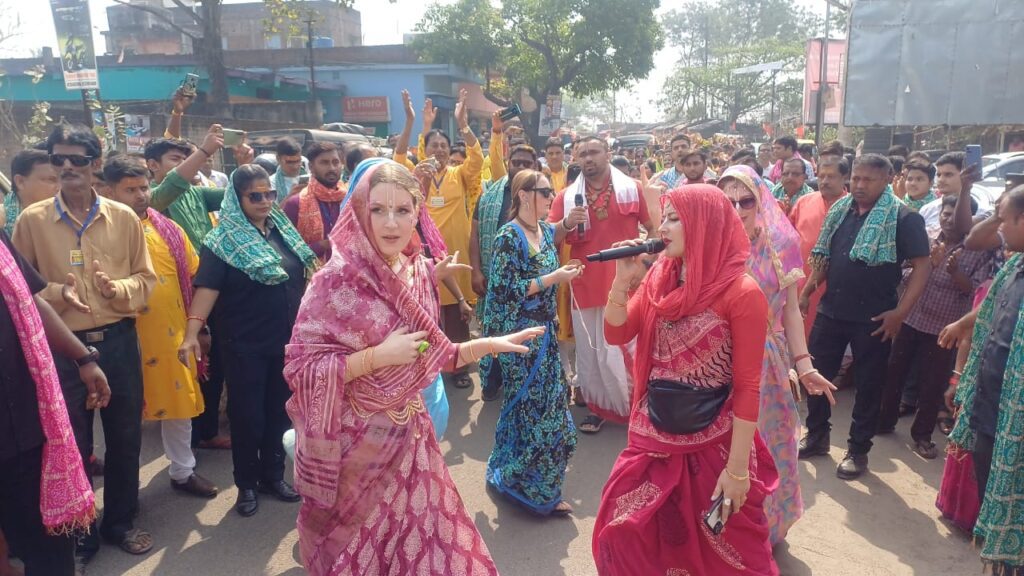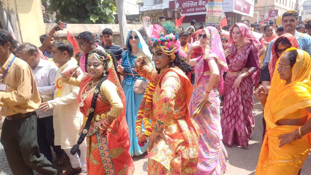 सबसे आगे ऊंट की सवारी फिर घुड़सवार और उसके बाद वृंदावन से आई विदेशी महिला कृष्ण भक्तों की टोली जो भजन गाते हुए शोभायात्रा की शोभा बढ़ा रही थी. इस कीर्तन दल के पीछे मुख्य कथावाचक श्री श्री 1008 महामंडलेश्वर स्वामी श्री इंद्रदेव जी सरस्वती महाराज का रथ शोभायात्रा में शामिल हुआ और उनके पीछे सैकड़ो की संख्या में महिला श्रद्धालु माथे पर कलश लिए शोभा यात्रा में शामिल थे.