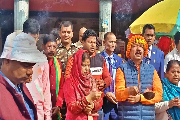 Dumka : बिहार सरकार के उद्योग मंत्री दिलीप जायसवाल सोमवार को बाबा बासुकीनाथ धाम पहुंचे, जहां उन्होंने विधि-विधान से भोलेनाथ की पूजा-अर्चना की। इस दौरान उनकी पत्नी, परिजन और स्थानीय भाजपा कार्यकर्ता भी उनके साथ मौजूद रहे। पूजा के बाद मंत्री ने जनकल्याण की कामना करते हुए महादेव-पार्वती की मंगल आरती भी की। मंदिर परिसर में मंत्री के आगमन को लेकर पुलिस प्रशासन की ओर से सुरक्षा के कड़े इंतजाम किए गए थे।