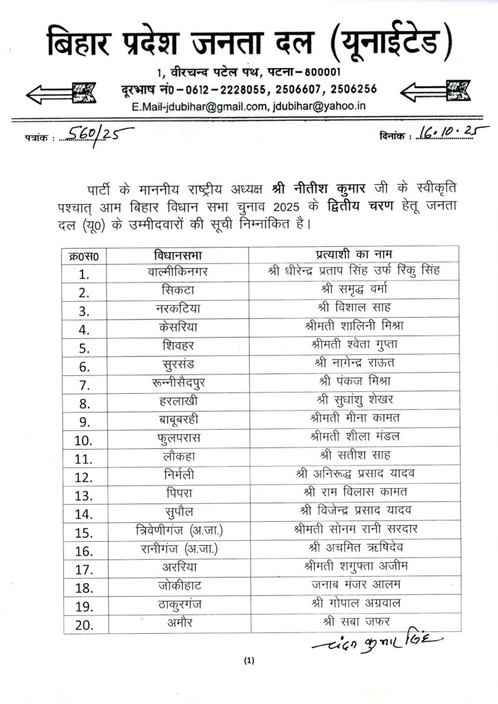 जदयू ने जारी की प्रत्याशियों की दूसरी सूची, 44 नामों की घोषणा, गोपाल मंडल का कटा टिकट