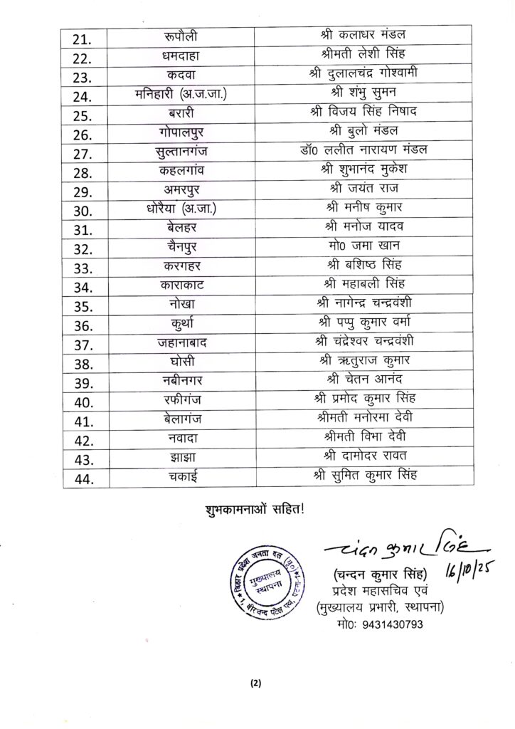दूसरी सूची में कई मौजूदा मंत्री और वरिष्ठ नेता दोबारा मैदान में उतरे हैं। इनमें विजेंद्र यादव, लेशी सिंह, शीला मंडल, कलाधर मंडल और सुमित सिंह के नाम प्रमुख हैं।